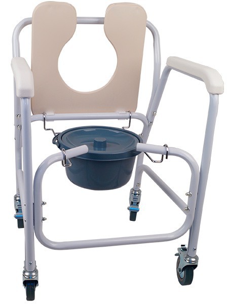 Con ruedas y asiento en forma de herradura para facilitar la higiene. Se puede poner encima del inodoro.